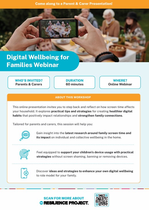 I am pleased to invite our parents and carers to a Digital Wellbeing for Families Workshop hosted online by The Resilience Project on Wednesday 11th March, 6:30-7:30pm (60 minutes).